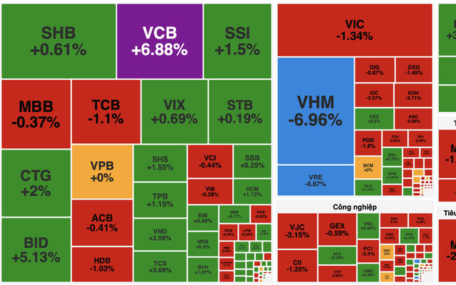 Ở chiều ngược lại, nhóm ngân hàng trở thành điểm tựa quan trọng giúp kìm hãm đà giảm của thị trường. Nổi bật nhất là cổ phiếu VCB khi tăng trần 6,88%, trở thành mã kéo chỉ số mạnh nhất với đóng góp gần 8 điểm.