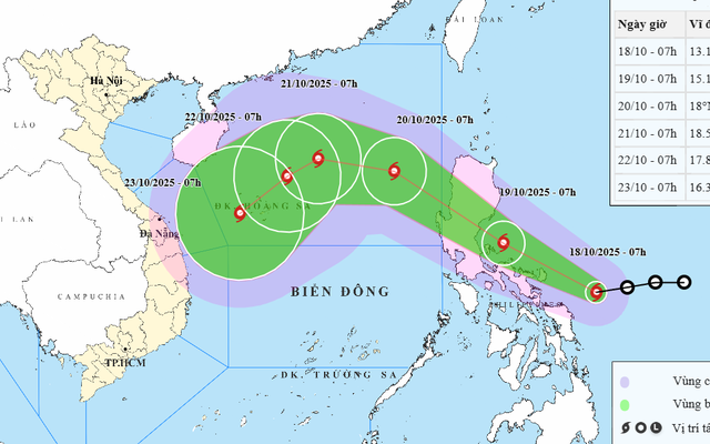 7h ngày 19/10 | Tây Tây Bắc, khoảng 20km/h | 15,1N-122,6E; trên vùng ven biển phía Đông đảo Lu-dông (Phi-líp-pin) | Có khả năng mạnh lên. Cấp 9, giật cấp 11 | ||