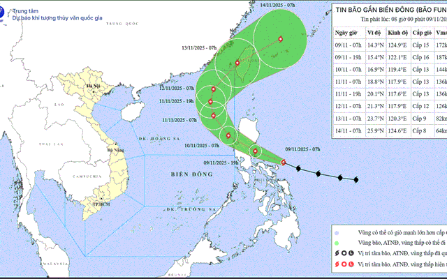 | 7h ngày 11/11 | Tây Tây Bắc, 10-15 km/h | 18,8N-117,9E; trên vùng biển phía Đông khu vực Bắc Biển Đông | Cấp 13, giật cấp 16 | Vĩ tuyến 15,00N-20,50N; phía Đông kinh tuyến 116,00E | Cấp 3: vùng biển phía Đông khu vực Bắc Biển Đông |