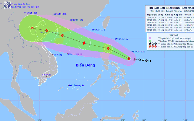 13h ngày 4/10 | Tây Tây Bắc, 25-30 km/h, đi vào Biển Đông và có khả năng mạnh thêm | 18,8-N-115,7E; trên vùng biển phía Đông khu vực Bắc Biển Đông, cách đặc khu Hoàng Sa khoảng 430km về phía Đông Bắc | Cấp 10-11, giật cấp 13 | Vĩ tuyến 16,50N-21,00N; phía Đông kinh tuyến 113,50E | Cấp 3: vùng biển phía Bắc khu vực Bắc Biển Đông |