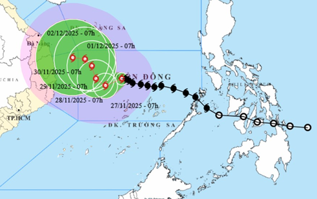 Trung tâm Dự báo khí tượng thủy văn quốc gia, hồi 7h ngày 27/11, vị trí tâm bão ở vào khoảng 13,0 độ Vĩ Bắc; 114,2 độ Kinh Đông, cách đảo Song Tử Tây khoảng 180km về phía Bắc. Sức gió mạnh nhất vùng gần tâm bão mạnh cấp 12 (118-133km/h), giật cấp 15. Di chuyển theo hướng Tây Tây Bắc, tốc độ 10-15km/h.