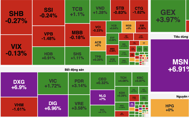 Tuy nhiên, áp lực bán từ bộ đôi vốn hóa lớn VHM và VIC khiến đà tăng trở nên chập chờn, chỉ số liên tục rung lắc trong nửa đầu phiên. Điểm sáng xuất hiện khi MSN bất ngờ bứt phá mạnh, nhanh chóng tăng kịch trần lên 88.200 đồng/cổ phiếu, khớp hơn 13,5 triệu đơn vị và còn dư mua trần gần 7,4 triệu cổ phiếu.