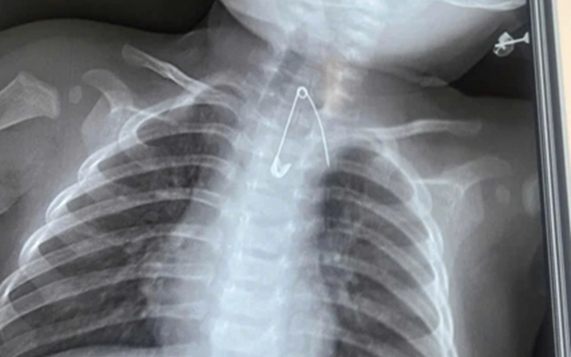Người nhà cho biết, gia đình có thói quen dùng kim tây (kim băng) ghim bùa bình an vào áo của bé. Qua thăm khám lâm sàng và thực hiện các xét nghiệm cận lâm sàng, các bác sĩ phát hiện một dị vật là kim tây nằm trong mô mềm, ở vị trí sát động mạch chủ, rất nguy hiểm.