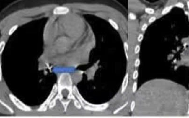 Ngay lập tức, gia đình đưa bé tới bệnh viện gần nhà. Sau chẩn đoán bằng chụp cắt lớp vi tính lồng ngực và nội soi phế quản ống mềm, các bác sĩ xác định dị vật nằm sâu tại phế quản trung gian bên phải, đầu ghim đã đâm xuyên vào thành phế quản gây chảy máu và phù nề.