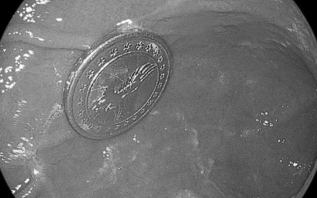 Đồng xu trong dạ dày bệnh nhi P.A.D. Ảnh: ĐVCC.