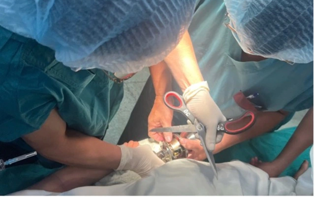Tại khoa Chỉnh hình Nhi, các bác sĩ xác định đây là trường hợp khó xử trí vì ổ khóa kim loại ôm chặt phần mềm ngón tay. Sau khi gây mê cho bệnh nhi, bác sĩ và điều dưỡng phải trực tiếp thao tác tháo ổ khóa, vừa đảm bảo an toàn cho phần mềm, gân và xương của ngón tay.