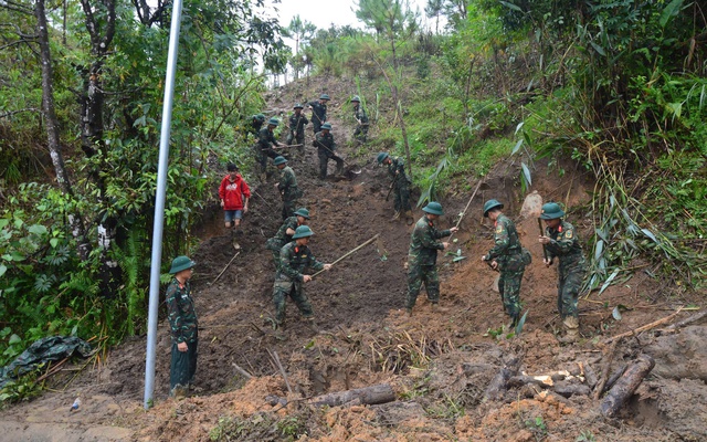 Ghi nhận của PV, trong điều kiện mưa lớn kéo dài, đường rừng trơn trượt, không có máy móc hỗ trợ, từng tốp bộ đội thay nhau dùng cuốc, xẻng thủ công dọn đất đá, mở từng đoạn đường bị vùi lấp.