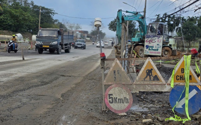 Tình trạng xuống cấp nặng khiến việc đi lại trên tuyến tiếp tục là nỗi ám ảnh của người dân. Từ nút giao Túy Loan đến ranh xã Đại Lộc (Quảng Nam), mặt đường chi chít ổ gà, ổ voi, nhiều đoạn bị băm nát, trồi lún, lộ đá dăm sắc cạnh.