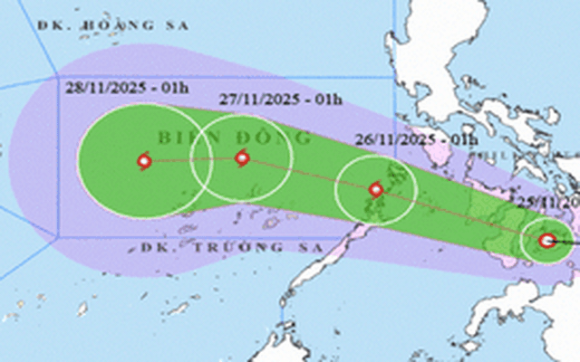 7h ngày 26/11 | Tây Tây Bắc, khoảng 20-25 km/h, đi vào Biển Đông | 11,9N-118,2E; trên vùng biển phía Đông khu vực Giữa Biển Đông | Có khả năng mạnh lên thành bão. Cấp 8, giật cấp 10 | Vĩ tuyến 9,50N-13,50N; phía Đông kinh tuyến 116,50E | Cấp 3: vùng biển phía Đông khu vực Giữa Biển Đông và vùng biển phía Đông Bắc khu vực Nam Biển Đông (bao gồm vùng biển phía Đông Bắc đặc khu Trường Sa) |