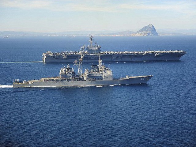 Tàu tuần dương và tàu sân bay Mỹ. (Ảnh: Getty)