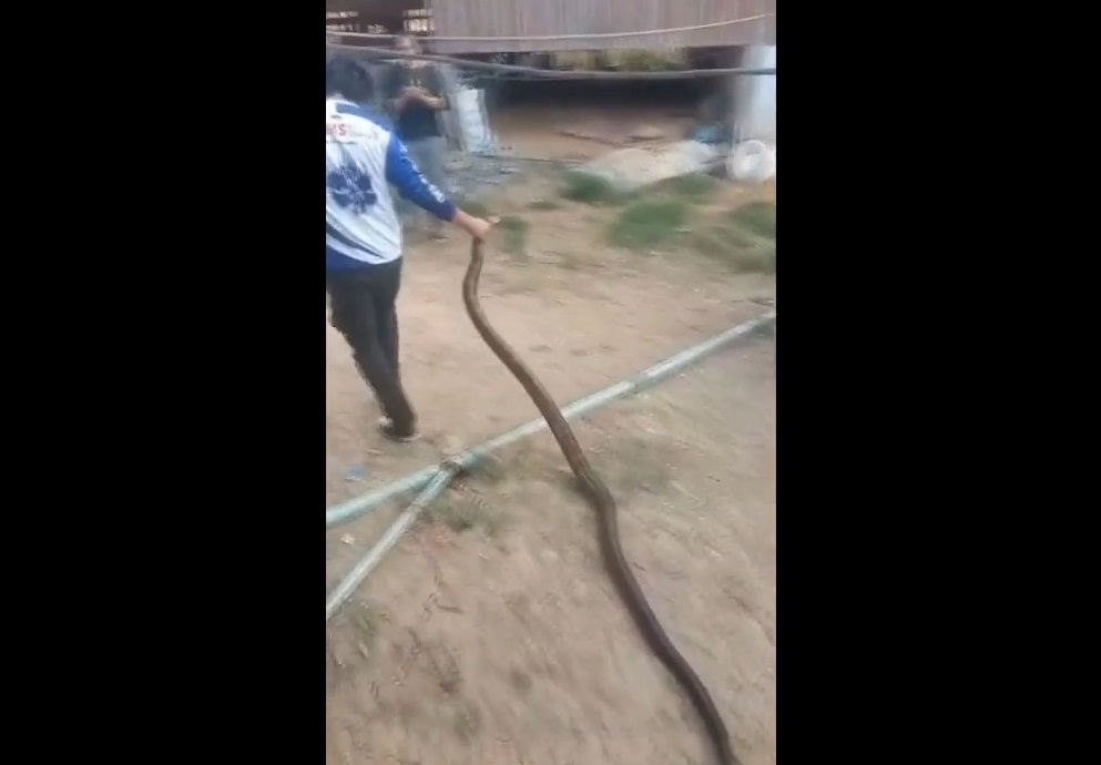 Đoạn clip ghi lại cho thấy, những người bắt rắn đang đối đầu với con rắn hổ mang ẩn náu trong một khe hở cạnh bồn tắm. Họ dùng chiếc kẹp chọc con vật ra khỏi nơi ẩn nấu rồi dùng tay tóm gọn.