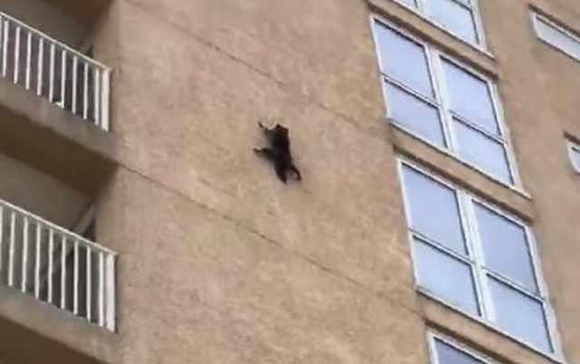 Con gấu mèo dừng lại ở tầng 9 rồi bất ngờ xoay người và phi thân khỏi bờ tường trong sự ngỡ ngàng của mọi người. Cú va chạm mạnh khiến người xem vô cùng bàng hoàng, lo sợ con vật sẽ bị thương nặng vì hành động liều lĩnh của mình. Ngay sau khi tiếp đất, con gấu nhanh chóng bò dậy và chạy đi như chẳng có chuyện gì xảy ra.