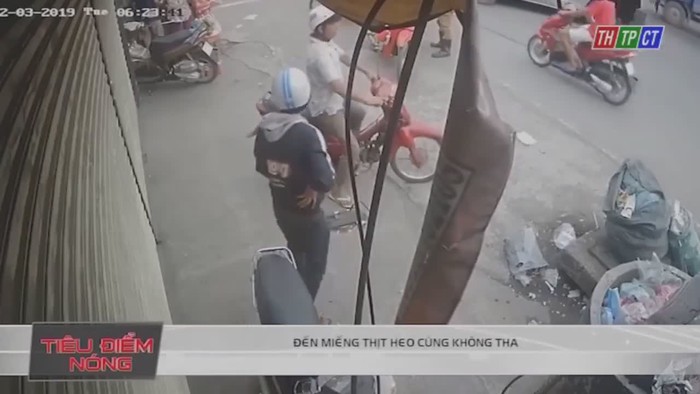 Những tưởng hắn sẽ bẻ khóa để trộm xe. Nhưng không, thứ đối tượng lấy cắp chính là bịch thịt heo. Sau đó, hắn nhanh chóng leo lên xe của đồng bọn rồi tẩu thoát.