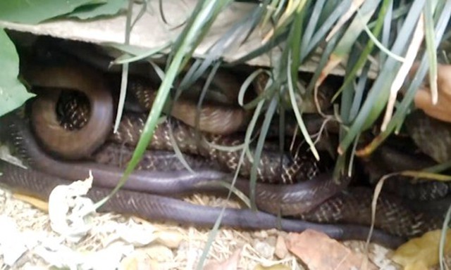 Hình ảnh ghi lại cho thấy, hàng chục con hổ mang dài gần 2m được nuôi trong vườn. Nam thanh niên bới từng bụi cỏ rậm, lật các mái tôn để khách có thể xem được nơi ẩn náu của chúng.