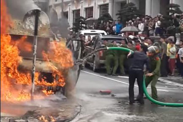 Sự việc xảy ra vào sáng ngày 4/8 tại đường Ngũ Chỉ Sơn, Sapa. Người dân quay lại cảnh tượng một chiếc xe khách 16 chỗ nằm bên đường bỗng nhiên bốc cháy dữ dội. Do lực lượng cứu hỏa chưa có mặt nên các chiến sĩ công an và người dân đi qua đã tận dụng chiếc xe hút bể phốt ở gần đó để dập lửa.