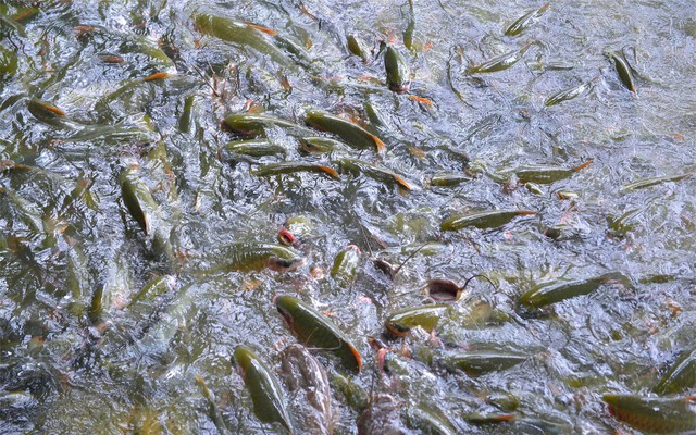 Đàn cá quẩn quanh gần người khi được cho thức ăn.