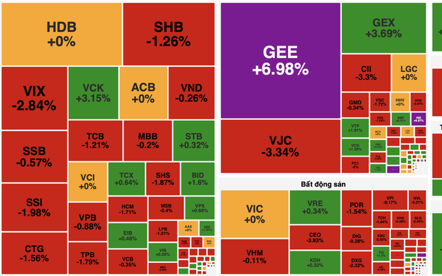 Ngành ngân hàng chịu áp lực bán mạnh khi nhiều mã giảm giá như CTG giảm 1,56%, SHB giảm 1,26%, SSB giảm 0,57%, TCB giảm 1,21%, MBB giảm 0,2%, VPB giảm 0,88%, VCB giảm 0,35%.