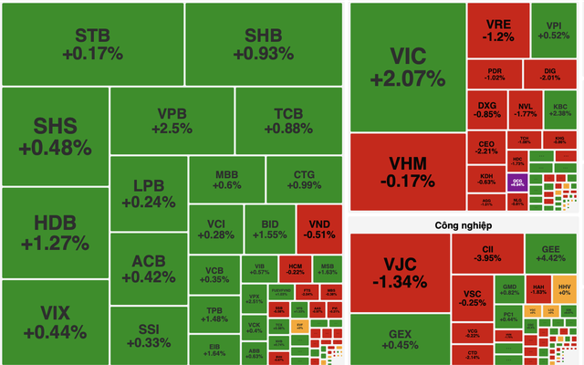 Nhóm ngân hàng tiếp tục hỗ trợ thị trường, nổi bật là VPB tăng 2,5% lên 28.700 đồng/cổ phiếu. Các mã khác như HDB tăng 1,3%, MBB tăng 0,6% và VCB tăng 0,3%.