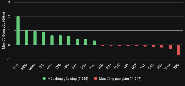 Cổ phiếu ngân hàng là động lực chính kéo VN-Index nới đà tăng ở cuối phiên, nổi bật CTG dẫn đầu đà tăng của thị trường khi đóng góp gần 2 điểm. Các mã MBB, VPB, EVF, STB, EIB, HDB, ACB, VCB, BID, BVB, VIB, OCB cũng tăng điểm tích cực. Trong ngành chỉ một số mã giảm trên dưới 1% như SHB, TPB, LPB, SSB.