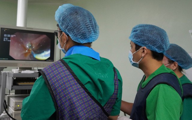 Sau hội chẩn nhiều chuyên khoa, ê kíp can thiệp quyết định thực hiện kỹ thuật ERCP (nội soi mật tụy ngược dòng) để khảo sát và can thiệp lấy dị vật. Dị vật này nghi ngờ xuyên qua đường mật, gây gián đoạn dòng chảy của mật và dẫn đến viêm đường mật, đau bụng kéo dài.