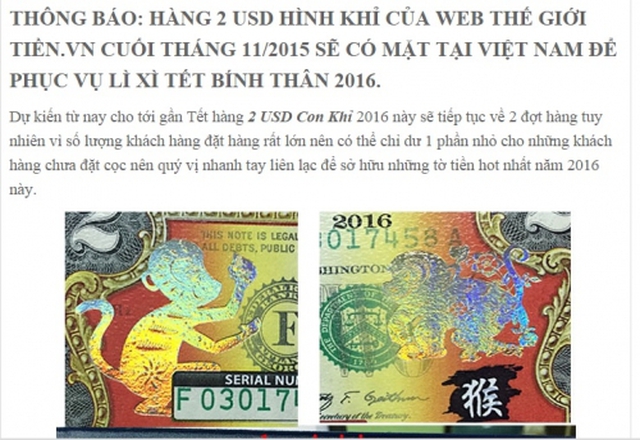 Theo ghi nhận của PV báo NĐT, năm nay tiền in hình con khỉ sẽ lên ngôi. Ông Nguyên Quang Hào, nhà phân phối tiền lì xì và tiền chơi tại Q.Phú Nhuận (TP.HCM) cho biết, năm nào cũng vậy, Mỹ cấp phép cho in một số linh vật và hình ảnh lưu niệm lên trên tờ tiền có giá trị thấp như 1 USD, 2 USD để làm quà tặng kỷ niệm cho khách du lịch, đặc biệt dành cho thị trường châu Á.