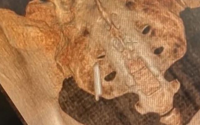 Khi các bác sĩ quan sát hình ảnh chi tiết, họ thấy rõ hình dạng của mảnh nhiệt kế bị vỡ nằm kẹt phía sau xương chậu của cô.
