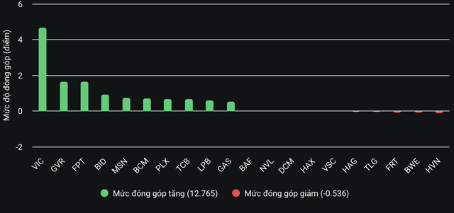 VIC trở thành động lực chính dẫn dắt đà tăng của thị trường khi tăng kịch trần lên 78.500 đồng và đóng góp gần 4,8 điểm vào VN-Index. Các mã khác trong nhóm bất động sản như DXG, TCH, KBC, VHM, VRE, NLG, IDC, SZC, NTL, KDH, IJC, AAV, VPI cũng đều kết phiên trong sắc xanh; thậm chí HQC còn tăng kịch trần.
