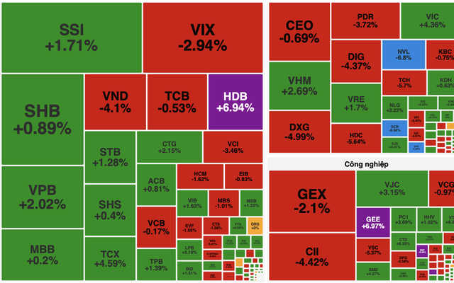 Tâm lý thị trường nhờ đó cải thiện đáng kể, sắc xanh lan rộng trên bảng điện tử. Các trụ cột như VIC, VHM, HDB, FPT đồng loạt tăng mạnh, giúp VN-Index dần mở rộng đà tăng và bứt phá ngoạn mục về cuối phiên.