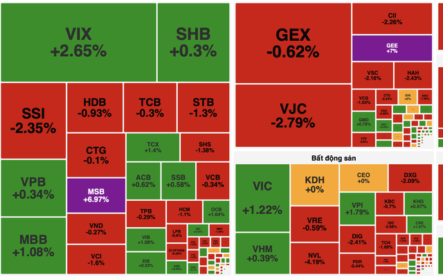 Nhóm ngân hàng cũng giao dịch tích cực khi SHB tăng 0,3%, VPB tăng 0,34%, MBB tăng 1,08%, ACB tăng 0,62% và SSB tăng 0,58%. Gây chú ý nhất là MSB khi bứt phá mạnh và tăng trần 6,97%.