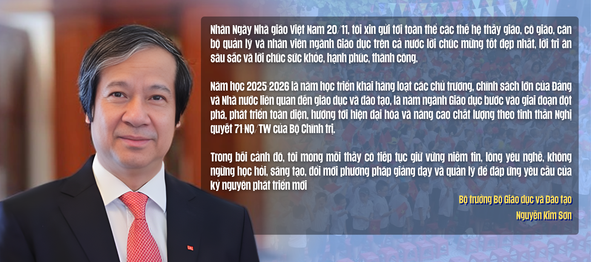Bộ trưởng Nguyễn Kim Sơn: Mọi đổi mới luôn bắt đầu từ yếu tố con người. Với ngành giáo dục, chuyện nâng cao chất lượng bên cạnh câu chuyện của chương trình hay sách giáo khoa, trước hết phải là câu chuyện của người thầy.