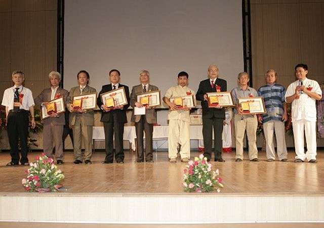 Võ sư Bình (thứ 6 từ trái sang) nhận bằng khen tại Đại hội dưỡng sinh toàn quốc 2012