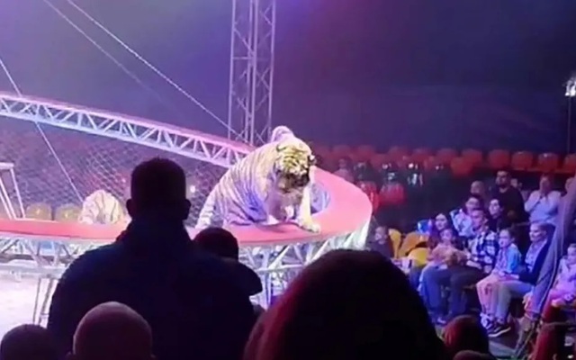 Ba con hổ đang ngồi trên những chiếc ghế đẩu thì tấm lưới bảo vệ xung quanh các nghệ sĩ biểu diễn bất ngờ rơi xuống đất tại rạp xiếc Dovgaluk.