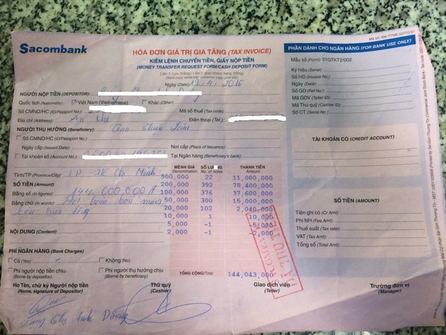 Hóa đơn mua bitcoin một nạn nhân chuyển tiền cho Trần Thiện Lâm. Ảnh: H.T