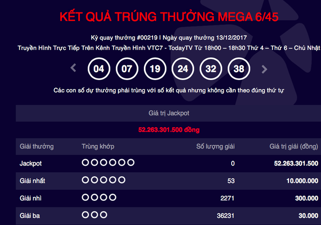 Theo kết quả xổ số Vietlott kỳ quay số mở thưởng thứ 219 loại hình Mega 6/45 diễn ra vào tối 13/12, giá trị giải Jackpot đã lên tới 52.263.301.500 đồng nhưng vẫn chưa có chủ nhân.