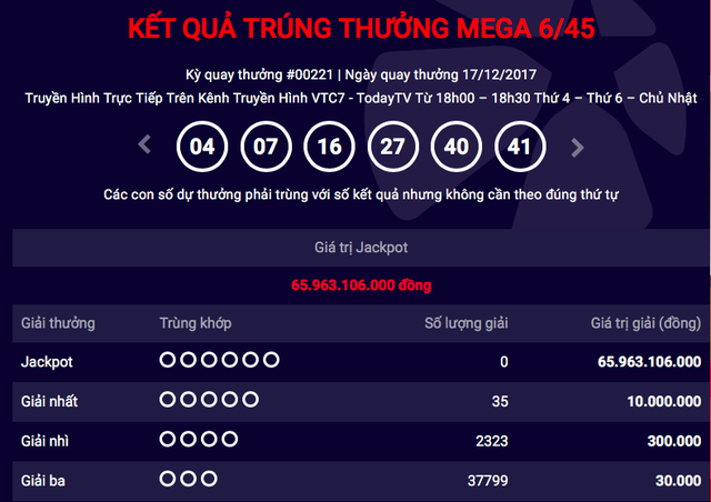 Theo kết quả quay số mở thưởng (QSMT) sản phẩm Mega 6/45 của công ty Xổ số điện toán Việt Nam (Vietlott), kỳ quay số mở thưởng thứ 221, mở thưởng ngày 17/12 cho thấy, dãy số đem lại may mắn cho người chơi lần lượt là 04 - 07 - 16 - 27 - 40 - 41.
