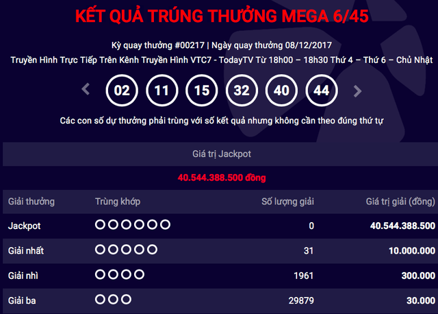 Theo kết quả quay số mở thưởng (QSMT) sản phẩm Mega 6/45 của công ty Xổ số điện toán Việt Nam (Vietlott), kỳ quay số mở thưởng thứ 217, mở thưởng ngày 8/12 cho thấy, dãy số đem lại may mắn cho người chơi lần lượt là 02-11-15-32-40-44.