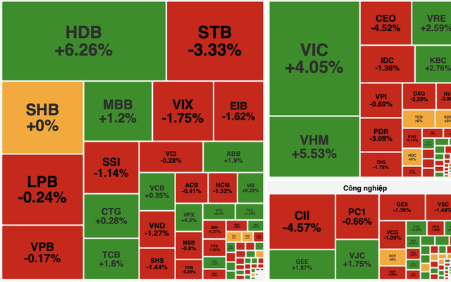 Ngoài ra, các mã như HDB, TCB, MBB, VPX và VJC cũng góp thêm điểm cho chỉ số. Ở chiều ngược lại, GAS, STB, BID, BVH và GVH là những cổ phiếu gây tác động tiêu cực nhất, lấy đi hơn 3,5 điểm của VN-Index.