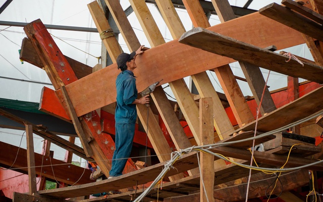 Trong khu xưởng của làng nghề Trung Kiên (xã Hải Lộc, tỉnh Nghệ An), bốn chiếc tàu cá lớn đang được hơn 20 công nhân khẩn trương hoàn thiện. Những tấm gỗ lớn dần được uốn cong, ghép khít vào nhau theo từng đường nét của thân tàu, công việc đòi hỏi kinh nghiệm và sự chính xác của những người thợ lành nghề.