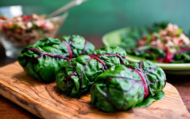 Cuộn thịt hấp: Dùng lá cải cầu vồng cuốn thịt băm, hấp chín.