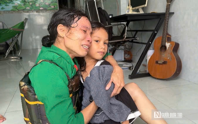 Bà Trương Thị Can gặp lại con sau khi được lực lượng cứu hộ ứng cứu tại khu vực bị cô lập do nước lũ
