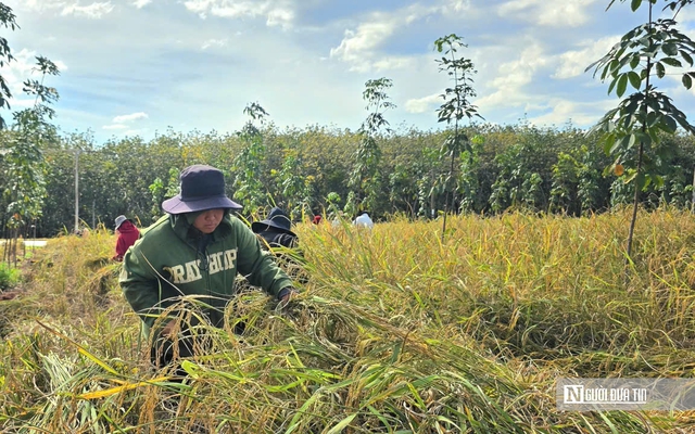 Ghi nhận của PV Người Đưa Tin vào những ngày giữa tháng 11, tranh thủ thời tiết thuận lợi, từ sáng sớm gia đình chị Năng Xuân Lu Hiệp (trú thôn Bình Giai, xã Đa Kia, tỉnh Đồng Nai) đang cùng bà con trong thôn ra rẫy gặt lúa. Một nét độc đáo trong canh tác lúa rẫy, là thay vì để đất trống, bà con Kh’mer đã khéo léo biến đất dưới những hàng cao su non thành nương rẫy, tiếp tục gieo trồng giống lúa truyền thống.