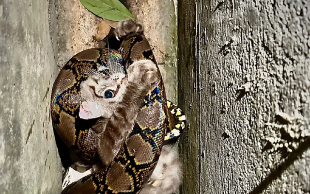 Nửa đêm nghe thấy tiếng động mạnh, một người đàn ông ở Singapore đã chạy ra sân và dũng cảm giải cứu một con mèo hoang bị trăn siết chặt.