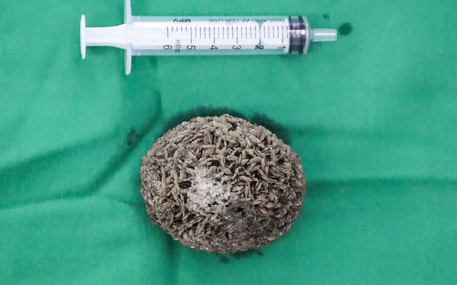Khai thác tiền sử bệnh trước đó, bệnh nhân đến khám trong tình trạng tiểu buốt, tiểu khó kéo dài, kèm đau vùng hạ vị. Qua thăm khám lâm sàng, siêu âm và chụp X-quang, các bác sĩ phát hiện trong bàng quang có viên sỏi kích thước khoảng 60x40 mm.
