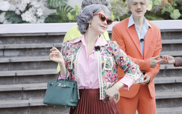 Trong lần trở lại Running Man sau 6 năm, Minh Hằng đảm nhiệm hình ảnh một quý bà sang chảnh, chiếc Hermès màu xanh lục bảo đóng vai trò tương phản với màu váy đỏ rượu.