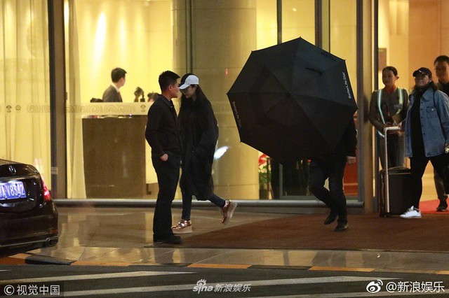 Hai trợ lý đi cùng Phạm Băng Băng một người kéo vali, một người dùng ô đen che chắn.