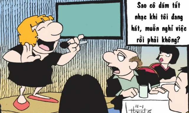 - Lúc nãy đi karaoke với sếp, lúc sếp hát đang hăng em lỡ tay bấm next, sếp lập tức sầm mặt lại.
