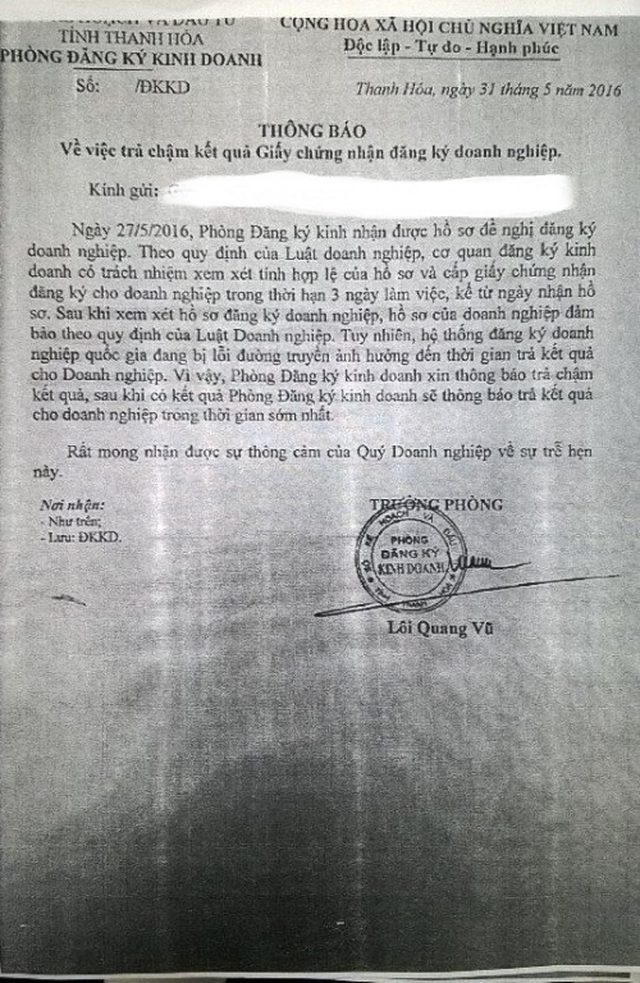 Tin tức liên quan về vụ việc Sở Kế hoạch & Đầu tư tỉnh Thanh Hóa thông báo cho doanh nghiệp vào ngày 31/5/2016, về việc chậm trả kết quả Giấy chứng nhận đăng ký doanh nghiệp là do hệ thống đăng ký doanh nghiệp quốc gia đang bị lỗi đường truyền. Phóng viên đã liên hệ với Cục Quản lý kinh doanh – Bộ Kế hoạch & Đầu tư để tìm hiểu thông tin.