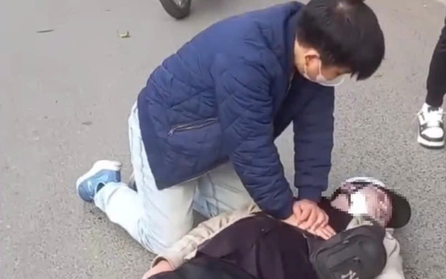 Bác sĩ Nguyễn Hữu Tiến thực hiện ép tim ngoài lồng ngực và thực hiện các biện pháp cấp cứu nam thanh niên bị tai nạn giao thông. Ảnh: Sở Y tế Hà Nội.