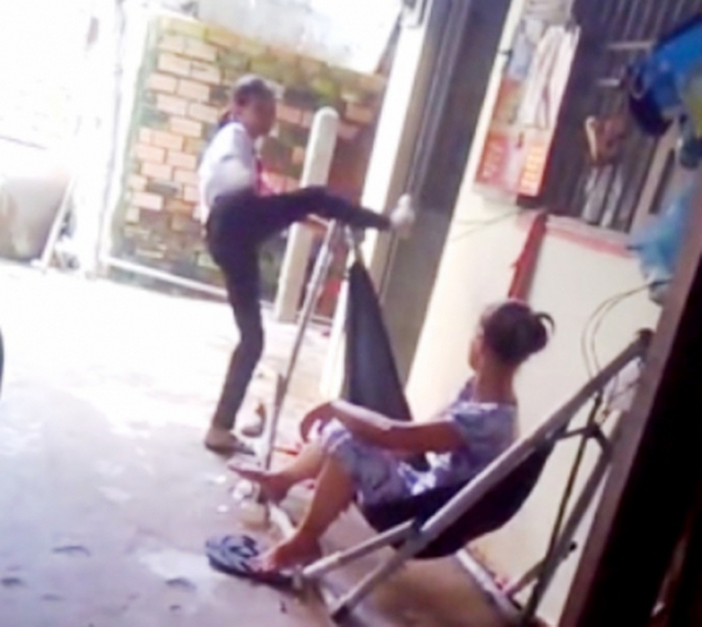 Nữ sinh tên Nh. đang tung cú đá về phía bà ngoại (ảnh chụp từ clip)