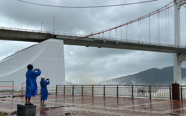 "Cảnh này hiếm thấy ở sông Hàn nên dù mưa to vẫn có rất đông người ra xem. Sóng mạnh đến mức đứng cách vài mét cũng bị hắt ướt", chị Trần Ngọc Anh, du khách từ Hà Nội, chia sẻ khi đang trú mưa gần cầu Thuận Phước.
